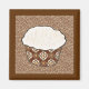 Magnet as a Cupcake frosted and topped with shredded coconut, in a decorative, chocolate brown and white wallpaper patterned cupcake wrapper, on a brown and cream Japanese swirled background