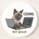 A stylized, graphic illustration of a focused Siamese cat at work—wearing thick white glasses and typing code on two laptops. Bright blue eyes, clean linework, and a warm neutral palette give this design a modern, professional vibe with a playful twist.