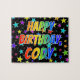 This vibrant and fun birthday-themed jigsaw puzzle design has the message "HAPPY BIRTHDAY, CODY" with the characters having a colourful rainbow spectrum inspired gradient pattern, in addition to a lively field of stars background pattern. A vibrant puzzle like this might be used to send birthday greetings to somebody named Cody. [~Z0000468]