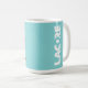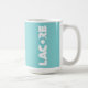 This humorous mug alerts people that you drink coffee for their protection and features a Lacore logo.
