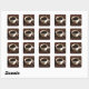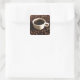 These stickers display a white demitasse cup of steaming freshly brewed coffee set on a bed of dark brown roasted coffee beans.