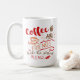 Great gift for coffee lovers and best friends. This typography design is lettered in bistro art style with a coffee quote and illustrations including a cup of coffee and a scrummy cupcake. The cute coffee saying reads "Coffee and Friends make the perfect Blend" and is lettered in cozy fall colors of red, orange and brown.