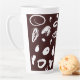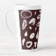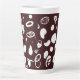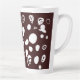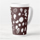 This mug exhibits different shapes white spots and circular lines symbolising coffee beans, over a dark brown surface. The illustration is hand drawn.