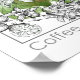 A poster featuring coffee beans medicinal herb illustrated with ink and watercolor in different stages of growth on the branches with a few white blossoms with the common and botanical names on the front. Try this design on a postcard, magnet, or notecard.