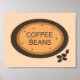 A modern coffee sign in orange and brown tones. Says 'coffee beans' a few loose coffee beans beside the sign. A soft orange background accents it. Great for a Coffee shop.