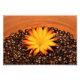 Cloth with a photograph in warm tones with coffee beans and a yellow daisy tinted with orange on a wooden background.