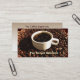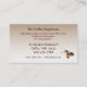 A white demitasse cup of steaming freshly brewed coffee set on a bed of dark brown roasted coffee beans is the theme of this elegant business card advertising a coffee bean emporium. The back has peanut butter cookies and a demitasse cup of coffee. The text mentions Fair Trade and Organic. All text can be customised to suit your individual business needs.