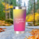 Thermal coffee glass with quote "Coffee because adulting is hard" featuring vibrant cool colourful gradient background.