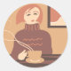 Illustration of a lady sitting at a table drinking a hot cup of coffee or tea.