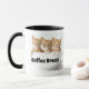 This ceramic coffee mug is shown with a photo print of cute three yellow kittens in a large cup over a white background. Text of " Coffee Break". Images and text on two sides of the mug which wrap around. Choose your interior and handle colour which is shown in black.