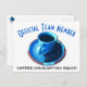 A funny horizontal postcard for coffee lovers and competitive types. The card features a digitally altered close-up photograph of a full blue cup and saucer with coffee beans. The arched blue text above the photograph reads "Official Team Member". The black text below the cup and saucer photograph reads "Coffee Consumption Squad". Fill in the template fields to change all or some text, remove text or edit using the design tool to select a font style, size, and colour you like.