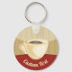 Beige cup of coffee on red table and wall background. Custom text on both sides.