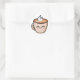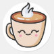 The art features a charming, hand-drawn coffee cup with a delightful smile. The cup has rosy cheeks and closed eyes, giving it a content and happy expression. A whimsical white swirl on top of the coffee represents steam or frothy milk, adding to the cosy and cheerful vibe of the illustration.