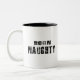 Coffee mug with Born Naughty in black destressed letters design