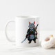 Coffee mug with samurai cat printed on cup face. Samurai pussy cat looking beautiful and majestic powerful greeting first thing in the morning.