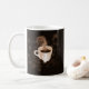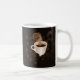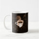 Illustration of a cup of coffee and beans with graphic splashes and swishes.