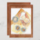 Invite friends or someone special to have coffee with this greeting card decorated with a cup of coffee decorated with foam hearts and swirls and plates of sweet pastries hand drawn with ink and watercolor on a coffee brown watercolor wash background. Accented with borders of different types of coffee drinks.