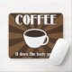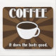 A vector graphic of a coffee cup filled with coffee is in the centre with the saying: "COFFEE - it does the body good." The background is a brown two-toned sunburst.
