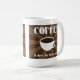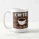A vector graphic of a coffee cup filled with coffee is in the centre with the saying: "COFFEE - it does the body good." The background is a brown two-toned sunburst.