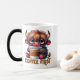 A funny and sarcastic design showcases a cute highland cow holding a to-go coffee cup brimming with coffee. With big blue eyes and a sleepy, tired expression, the cow rests its head on the cup's lid, its fluffy black fur adding to the charm. The colorful text reads, "Coffee first." This playful design is available on a wide variety of products, making perfect gifts for coffee lovers.