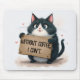 Fun coffee quote featuring a black-and-white cartoon cat holding a cardboard sign.