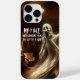The iPhone case features a detailed and eerie ghostly figure with a horrified expression, perfectly capturing the agony of discovering there's no more coffee. The ghost, with its skeletal frame and flowing ethereal form, stands out against a cosy, dark, and vintage-style living room background. The distressed, dripping text above the image reads, "MY FACE" and below the image, "When Someone Says the Coffee is Gone!" in a spooky font, adding to the overall haunted and humourous effect.