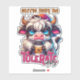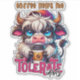 A funny, sarcastic, and colourful design showcases an adorable highland cow clutching a takeout coffee cup. The cup features a coffee bean and a black lid. The cow, with its big blue eyes and black-and-white fur, adds charm to the design. The vibrant text reads, "Coffee helps me tolerate idiots." This design is available on various products, making it a perfect gift for coffee lovers.