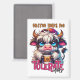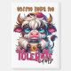 A funny, sarcastic, and colourful design showcases an adorable highland cow clutching a takeout coffee cup. The cup features a coffee bean and a black lid. The cow, with its big blue eyes and black-and-white fur, adds charm to the design. The vibrant text reads, "Coffee helps me tolerate idiots." This design is available on various products, making it a perfect gift for coffee lovers.