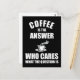 Coffee Is The Answer Who Cares What The Question Is. This funny coffee accessory is a great Christmas, birthday, Mother’s Day or Father’s Day coffee gift for a coffee lover. Perfect for coffee drinkers & coffee addicts. Coffee is the answer to everything! Do you love to drink coffee, cappuccino, lattes, mocha or espresso in the morning? Are you addicted to coffee & caffeine? If you can’t go a day without coffee, then this design is for you! Features a graphic of a cup of hot coffee.