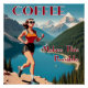You run over high mountains and do ultra running races because of coffee and coffee alone. This great design shows a runner in the mountains in the style of a retro vintage travel poster.