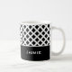 Ceramic coffee mug is shown with a black and white art print.