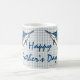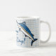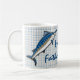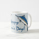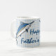 Not many fish are more incredibly beautiful than the blue marlin -- and not many fish are larger. The blue marlin is the largest of the Atlantic marlins and, seriously, one of the biggest fish in the world. As with some species, the female is often quite a bit larger than the male. Females can grow up to 14 feet long and can weigh more than 1,900 pounds, though the average runs more around 11 feet long and 300-ish pounds. A deep blue on top and silvery-white beneath, with a pronounced dorsal fin and a long, lethal, spear-shaped upper jaw (that some refer to as a bill), blue marlins are one of the most easily identifiable and recognisable fish in the world. Marlins are renown for their incredible stamina in a fight when they are hooked, which makes them a trophied favourite of big game fishermen. Though it can also be said of virtually any super big fish, I can't imagine there's much more thrilling to the avid angler than hooking one of these giants and seeing it break water in the fight. This design pays homage more to this majestic fish than the anglers that seek it. For this wonderful coffee mug, two marlins frame a text element, "Happy Father's Day". Obviously, an excellent choice for Father's Day, you are welcome to modify the text to better suit your celebration for your favourite angler.