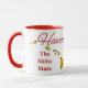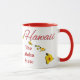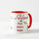 Aloha! Hawaii -- our jewel in the Pacific. Hawaii consists of eight MAIN islands: Niihau, Kauai, Oahu, Maui, Molokai, Lanai, Kahoolawe and the "Big Island" of Hawaii. The "Big Island" is getting even bigger. It is estimated that the island of Hawaii grows by more than 40 acres every year because of the Kilauea Volcano which has been erupting for nearly 30 years. Though the official nickname is "The Aloha State", Hawaii is also known as "The Islands of Aloha" and "Paradise". And, no wonder. The island is lush and tropical with exotic agricultural products like pineapples and cacao and vanilla and coffee. And, the islanders are well aware of their strengths, having passed laws that prohibit billboards and, in some cases, prohibit buildings being built taller than the palm trees . . . nothing to spoil the spectacular views. And it's not just the amazing varieties of plants and flowers, the beaches of the Hawaiian islands can have gold, red, black or even green sand. The Hawaiian islands have a beautiful and rich history, extending back as far as 124 A.D. Other than the plethora of tourists lucky enough to vacation in this lovely state, the folks that live there are, generally, broken into two catagories: "Hawaiians" are those with native ancestry from the islands; "locals" are those that are born and raised there but have no ancestral connection. Many people are unaware that when Pearl Harbour was attacked in 1941, Hawaii had not yet become a state. Hawaii became our 50th glorious state in 1959. This delightful design, celebrating the LAST official state in the United States, offers an outline of the Islands of Hawaii, filled with their state flower, the stunning, yellow hibiscus. This is layered with a flame red "Hawaii". This gorgeous coffee mug is a terrific option for state memorabilia collectors or for anyone wanting to pay homage to our amazing 50th state. The original state outline is accented by the flame red "HAWAII" and "The Aloha State" is in the lower corner and beautifully coordinates with the handle and brim of this delightful cup.