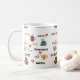 A white coffee mug with the word "coffee" in different languages and fonts and images of coffee mugs and hearts. This would make a perfect gift for any coffee lover.