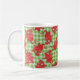 A cool white Coffee Mug with a pattern of cute red dragons on a green check gingham background.