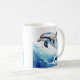 This coffee mug features an intricate and beautifully detailed design of a playful dolphin jumping out of the water. The colors used in the design are vibrant and eye-catching, with shades of blue, gray, and white being the predominant colors.