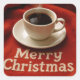 A steaming cup of black coffee rests on a white saucer against a red background, with the words "Merry Christmas" elegantly printed beneath
