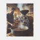 A close-up of hands in a worn apron carefully adding a scoop of rich, brown coffee beans into a vintage coffee roasting machine. Steam or smoke gracefully rises from the machine, hinting at the aromatic roasting process within. The industrial yet inviting backdrop features a rustic brick wall and warm lighting, reminiscent of a cosy coffee shop or roastery. Shelves filled with coffee-related items add to the authentic café ambiance.