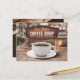 Imagine the irresistible aroma of freshly brewed coffee blending with the sweet warmth of freshly baked pastries, inviting customers to linger. If your coffee shop exudes that cosy, welcoming atmosphere, why not share it with the world through a thoughtfully designed business card? An attractive postcard for coffee shops to advertise their products, the design has rustic wood touches, a faded out coffee shop background, all in rich brown tones. On the back is an opportunity to list your menu such as coffee, croissants, sandwiches, smoothies and more, as well as a brief paragraph about your coffee store, location, phone number, email and website. The top has a badge for you to advertise a special or one of your bestselling coffees. Designed to capture the essence of your café, this postcard will not only elevate your professional image but also entice clients to experience the warmth and flavour you offer.