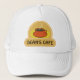 © Sunny Mars Designs. Coffee Cup Cafe Trucker Hat – Cool coffee shop hat or cap with a modern, trendy, stylish, cute, stylised graphic illustration icon design of a steaming mug or cup of coffee and saucer. Customise it by adding your own text, name or cafe name to it or buy it as is.