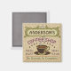 This coffee-themed square magnet is perfect for anyone who runs their own coffee shop or has a coffee theme in their home kitchen decor. Done in retro brown, green, purple and hints of orange, this espresso / cappuccino inspired design features a cup on a saucer, two personalised text banners and the words "Coffee Shop / Fresh Roast / Great Flavour" in purple.