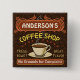 This coffee-themed square button is perfect for anyone who runs their own coffee shop or loves the coffee theme. Done in retro brown, orange, beige and yellow, this espresso / cappuccino inspired design features a cup on a saucer, two personalised text banners and the words "Coffee Shop / Fresh Roast / Great Flavour" in yellow.