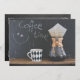 Coffee themed get together / party invitation. A chalkboard in the back says "coffee time" with a smiley face, written in chalk. In the front on a rustic wooden table is a coffee mug with a diamond pattern design in black and white. Sitting beside the coffee cup is a coffee pot with a large filter and a freshly brewed pot of coffee. Looks rustic and old fashioned. The back of the invitation is customisable for you to put all your party details, on a chalkboard texture design.