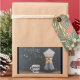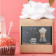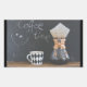 A chalkboard in the back says "coffee time" with a smiley face, written in chalk. In the front on a rustic wooden table is a coffee mug with a diamond pattern design in black and white. Sitting beside the coffee cup is a coffee pot with a large filter and a freshly brewed pot of coffee. Looks rustic and old fashioned.