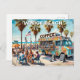 The watercolor painting beautifully captures a food truck selling coffee in Venice Beach, California. The truck is vibrant and artistically decorated with colourful murals and beach-themed motifs, parked on the bustling boardwalk. The background features the ocean and palm trees swaying gently, encapsulating the essence of the beach setting. Around the truck, a diverse crowd of beachgoers, skaters, and tourists enjoy their coffee, contributing to the lively atmosphere. The scene is quintessentially Venice Beach, with people lounging on beach chairs or sitting directly on the boardwalk, all under the bright California sun. The painting uses a palette of bright, sunny colours to emphasize the laid-back vibe and eclectic culture of this iconic Californian hotspot.
