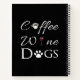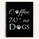 A perfect notebook for those who love coffee, wine, and dogs! This notebook design features a fancy text for coffee with a coffee cup adornment for the letter "o", wine which contains a glass of red wine for the letter "i", and dogs with a paw print embellishment in replacement of the "o". Additional gift items available with this design as well.