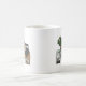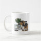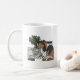 Enjoy a hot beverage in this mug Featuring a cartoon image of a sheltie having a coffee