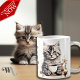 Adorable illustrations of cute kittens with a coffee cup accented with flowers, the text reads: "Mornings are for having coffee with my cat" and this can be changed to anything you like - Each side of the mug has a different kitten illustration - we offer 16 different mugs so you can mix and match creating a cute coordinated set as a lovely gift for a housewarming, Christmas or new kitten in the family.