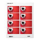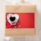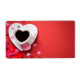 Coffee with red gift box and cookie in shape of heart. Composition for Valentines Day on red paper background. Top view. Copy space