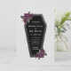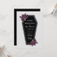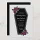 Dark and beautiful, this coffin wedding invitation is perfect for a gothic or Halloween wedding. Coffin has grey glitter sparkle around the edges and purple roses with gold and grey green leaves. This lines at the edges are a nice touch. See coordinating items in our shop, Enchanted Finch.